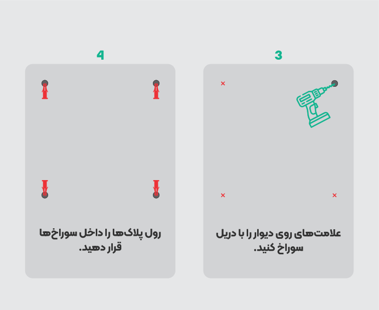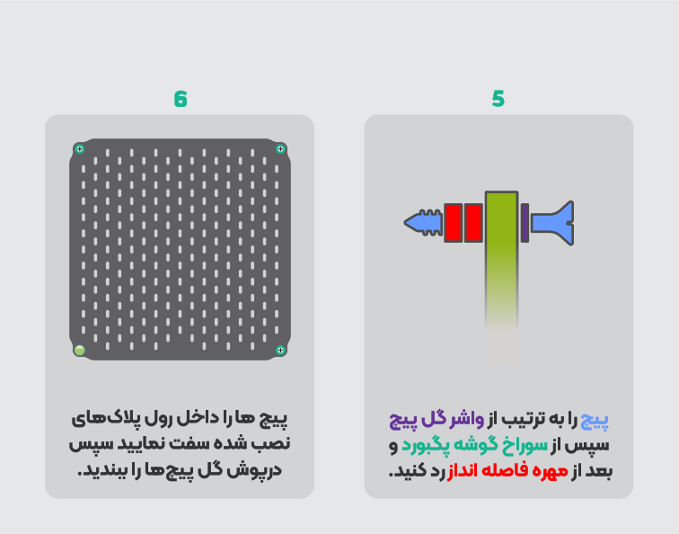 اگر دیوار از جنس گچی یا مشابه آن است، از رولپلاک برای افزایش استحکام نصب استفاده کنید؛ پیچها را از طریق پگ بورد و رولپلاک به دیوار پیچ کنید.