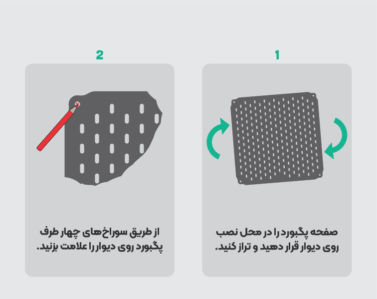اطمینان حاصل کنید که دیوار انتخابی، قدرت تحمل وزن پگ بورد و ابزارهای متصل به آن را دارد.