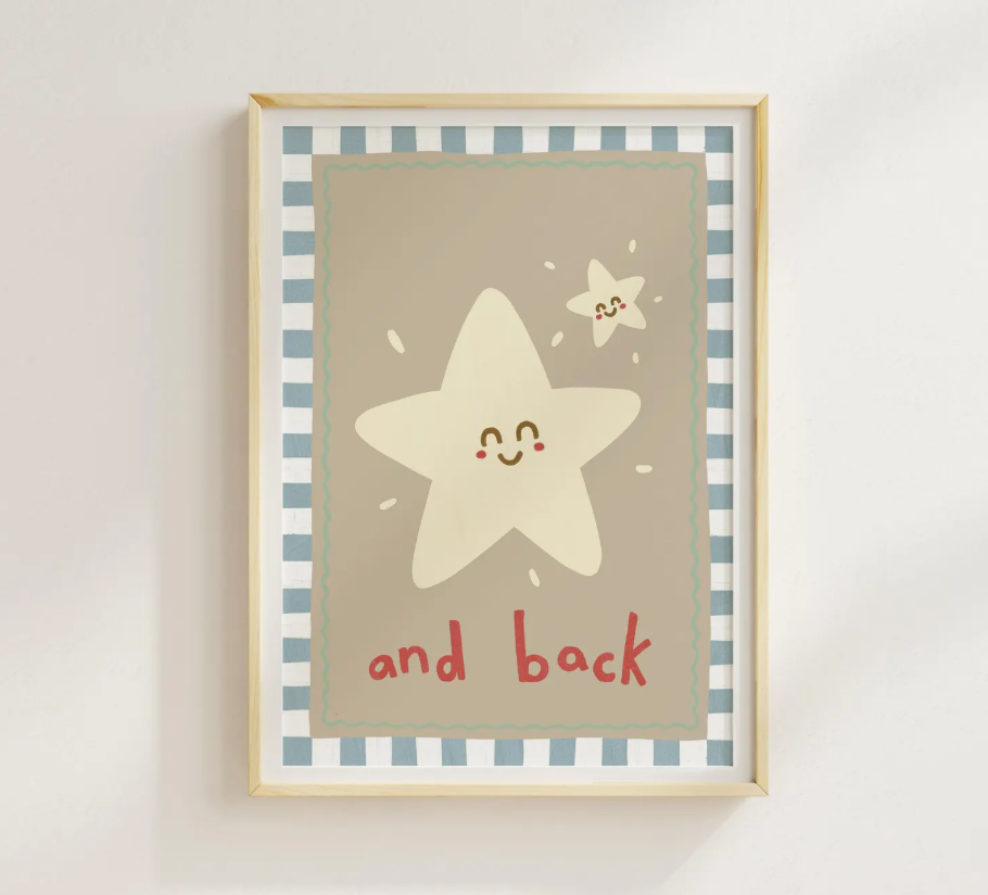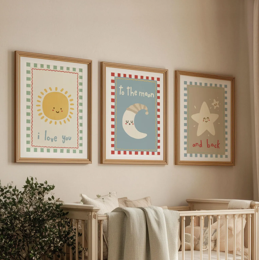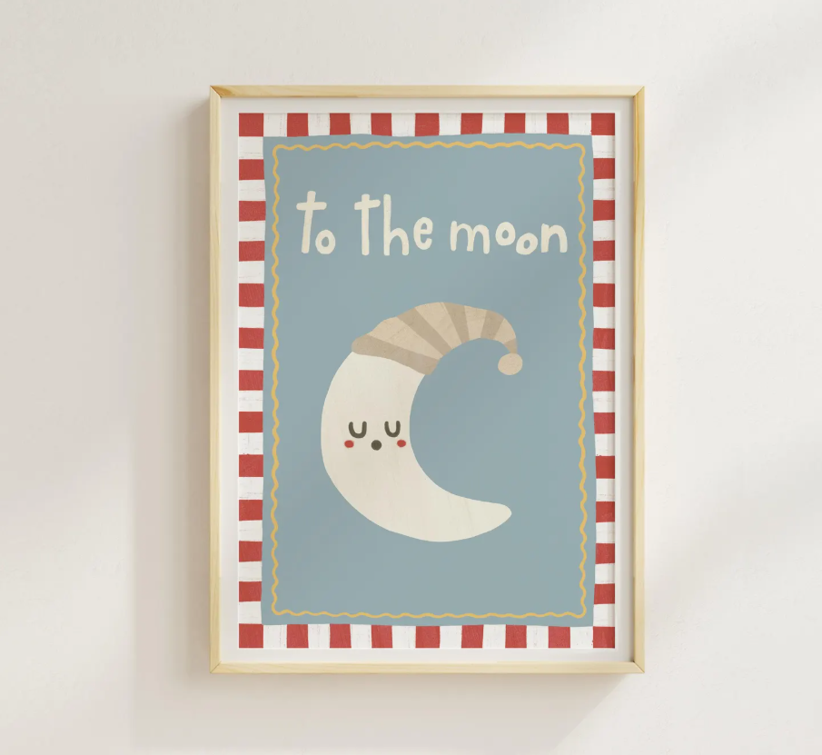 2. تابلو دوم (ماه): با حاشیه چهارخانه قرمز/زرشکی و متن “to the moon”. ماه با کلاه خواب، نماد آرامش شبانه و خواب راحت کودک است.