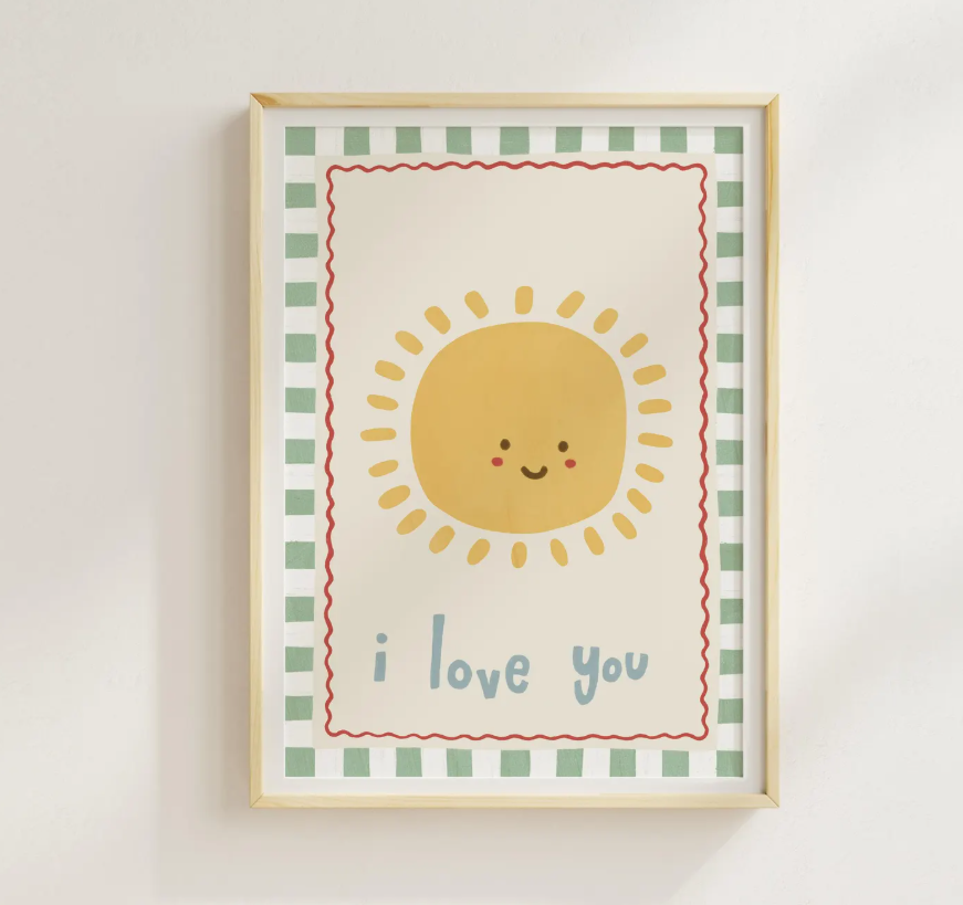 1. تابلو اول (خورشید): با حاشیه شطرنجی سبز و متن “i love you”. خورشید نماد آغاز روز و گرمای عشق والدین است.
