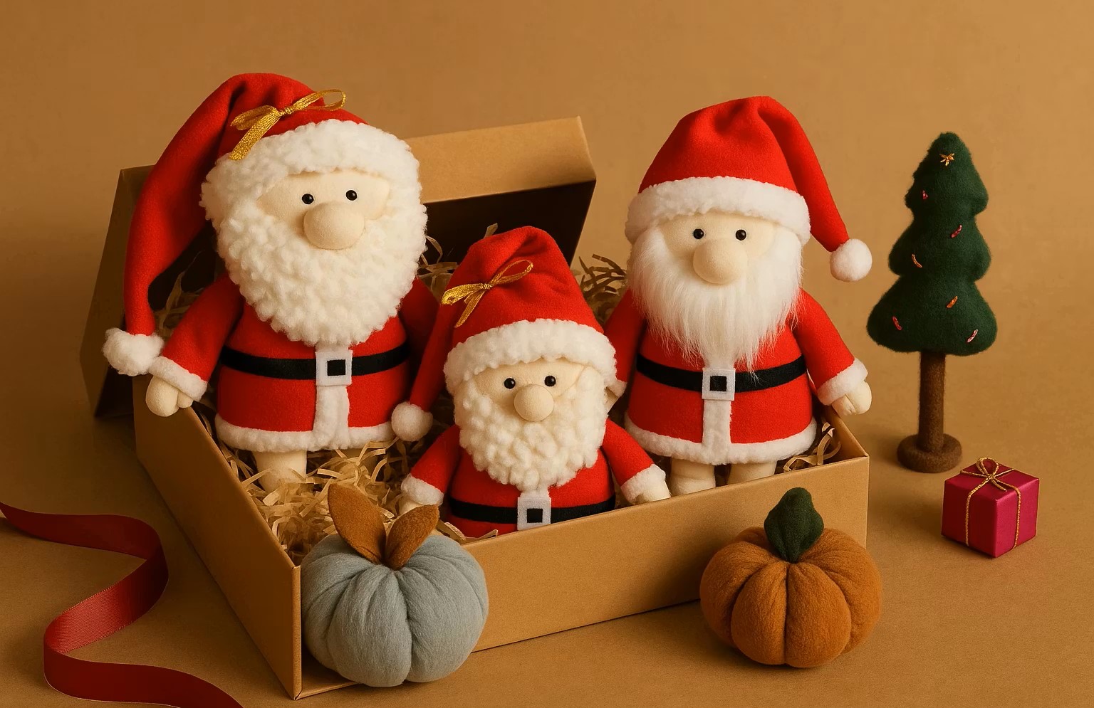 ستارههای این مجموعه، سه عروسک بابانوئل تپل و دوستداشتنی هستند که با ریشهای پشمالو و کلاههای قرمز بلندشان، لبخند را به لب هر بینندهای میآورند. اما ماجرا به همینجا ختم نمیشود؛ وجود دو عدد کدو تنبل پارچهای (در رنگهای خاکی و طوسی ملایم) و یک درخت کاج نمدی کوچک، ترکیب رنگی فوقالعادهای ایجاد کرده که برای عکاسیهای آتلیهای و دکوراسیون مدرن بسیار مناسب است. حتی یک جعبه کادویی کوچک نمادین هم در کنار اینها قرار دارد تا پکیج کامل باشد.
