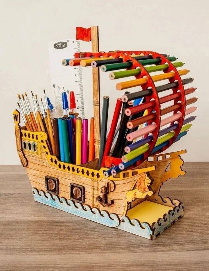 جامدادی چوبی طرح کشتی بادبانی | نظم دهنده مداد و خودکار برای میز تحریر