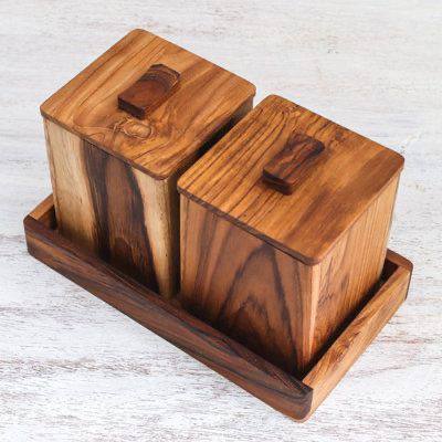 ست بانکه چوبی درب دار روی یک سینی چوبی متناسب قرار میگیرد که نه تنها نظم و زیبایی را دوچندان میکند، بلکه امکان جابجایی آسان و یکپارچه بانکهها را فراهم میآورد. میتوانید این ست را به راحتی از آشپزخانه به میز غذاخوری یا فضای سرو چای منتقل کنید.