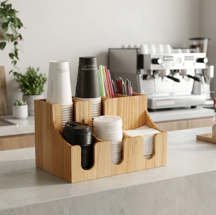 • تفکیک هوشمند فضا: دارای ۴ بخش مجزا برای لیوان‌های سایز بزرگ و متوسط، درب لیوان، نی/همزن و دستمال کاغذی.