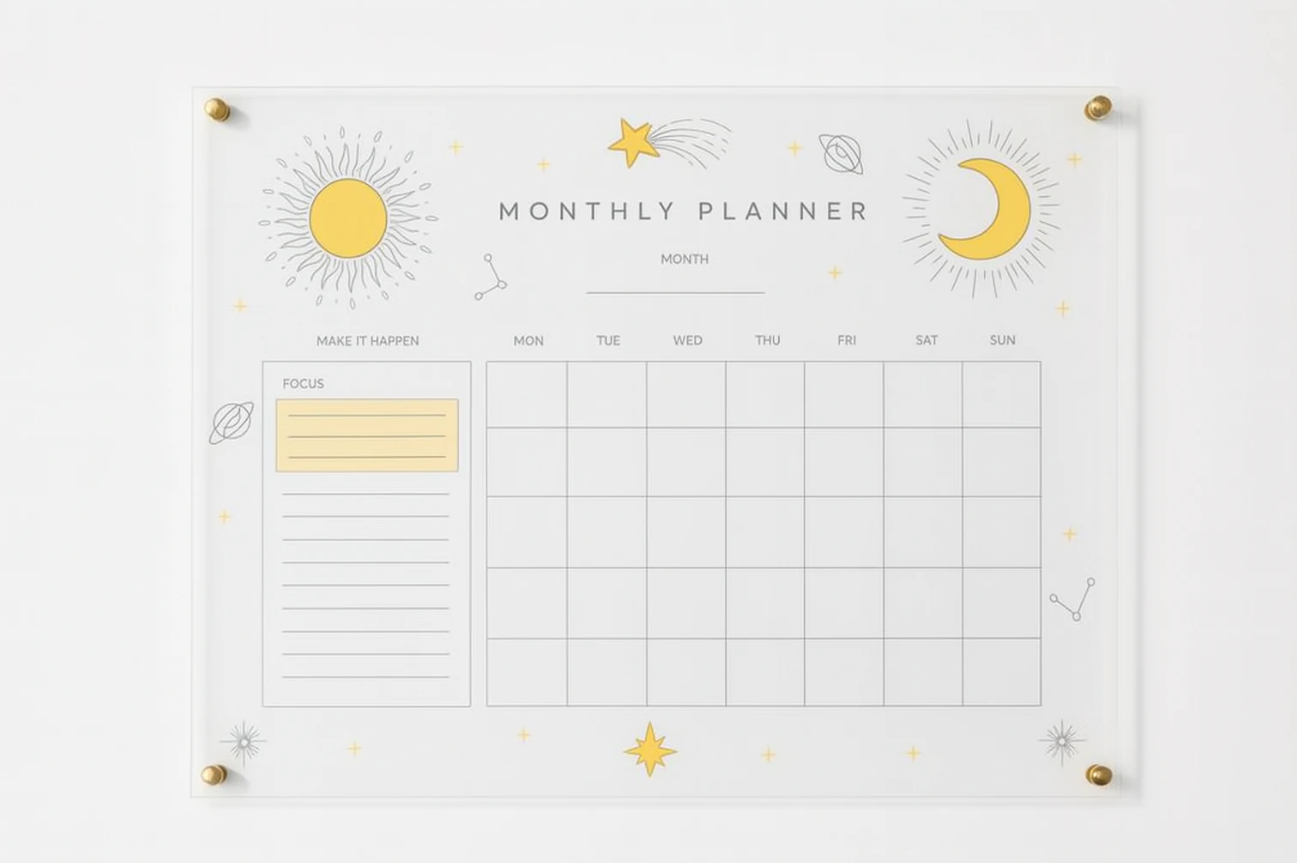 در دنیای شلوغ امروز، داشتن یک دید کلی از مسیر پیش رو ضروری است. این پلنر دیواری اکریلیک، جایگزینی مدرن، مینیمال و بسیار شیک برای وایت‌بردهای اداری قدیمی است. طراحی این محصول با الهام از اجرام آسمانی انجام شده است؛ خورشید نماد انرژی و ماه نماد آرامش. این المان‌ها با ظرافت تمام بر روی بدنه شفاف پلنر چاپ شده‌اند.