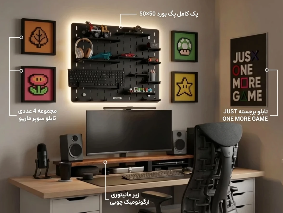 دیوارهای خالی، قاتل جذابیت اتاقهای گیمینگ هستند. ترکیب تابلو برجسته تایپوگرافی و ست ۴ تایی تابلوهای پیکسل آرت، تعادلی بین سبک مدرن و کلاسیک (رترو گیمینگ) ایجاد میکند. این تابلوها با دقت بالا ساخته شده و رنگهای زندهای دارند.