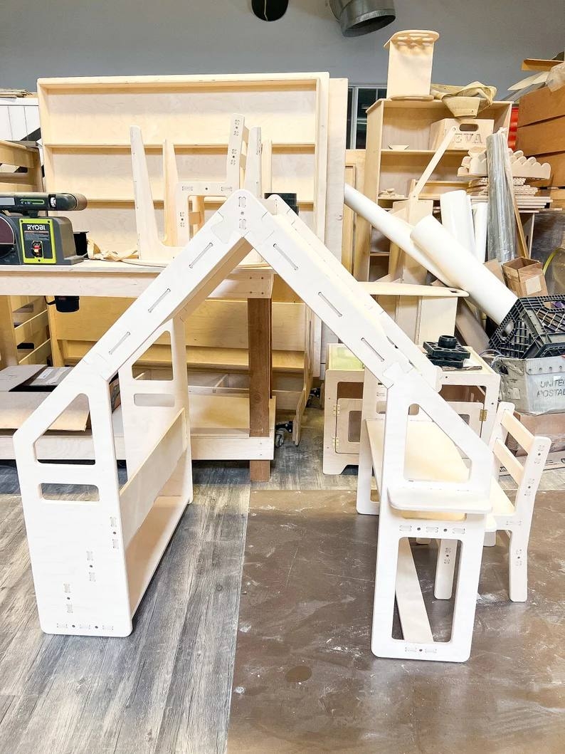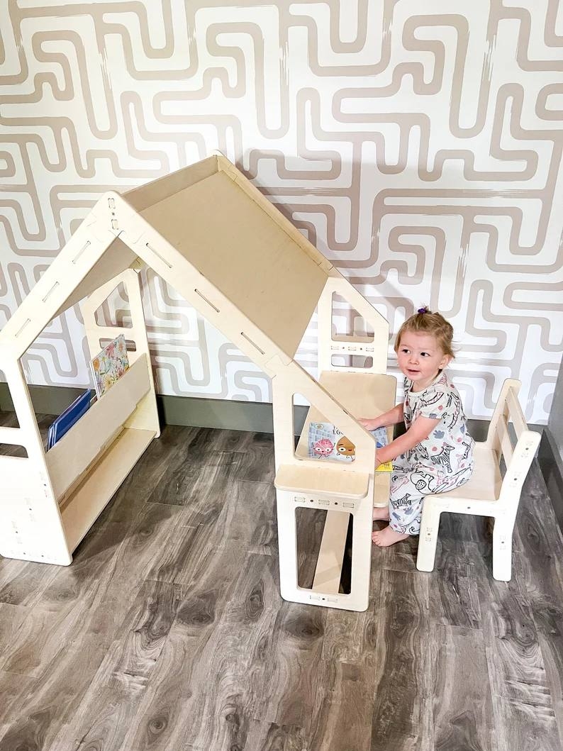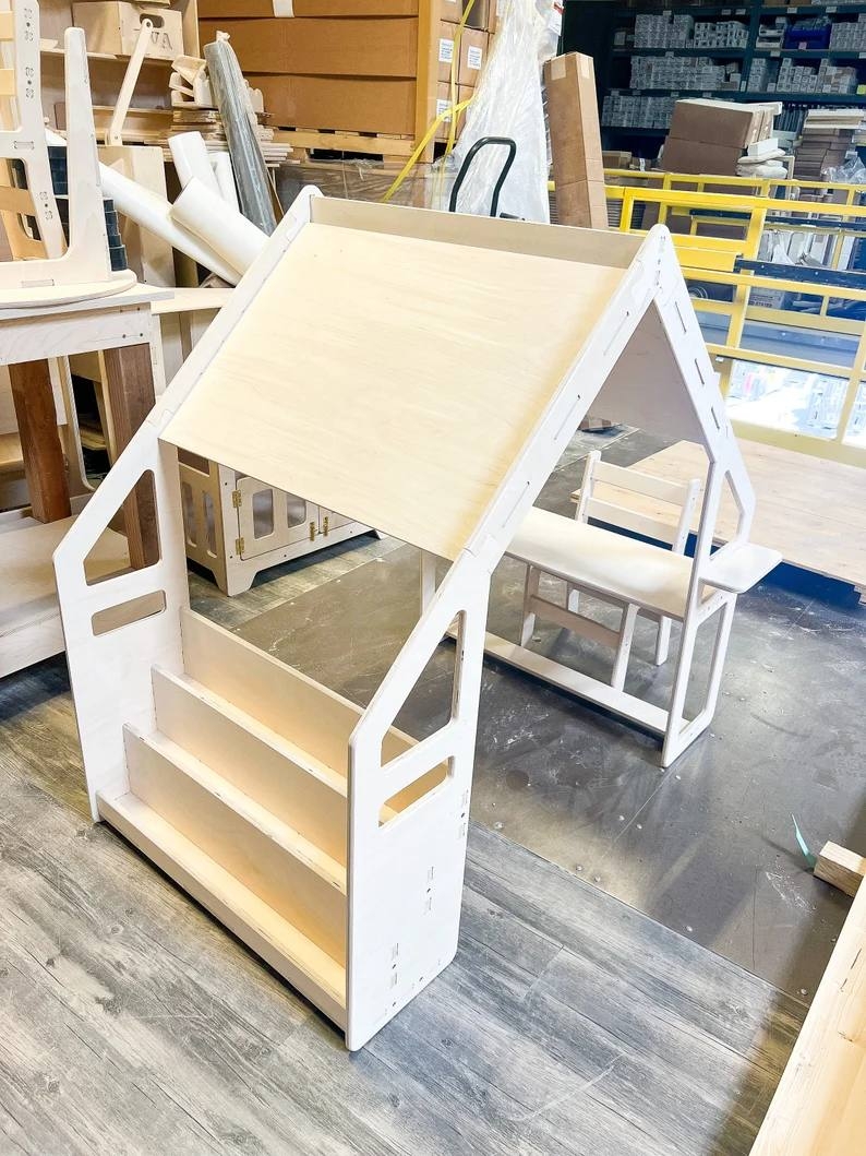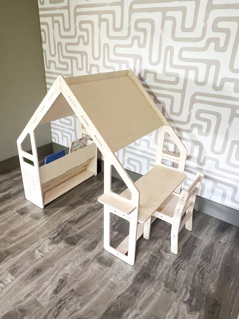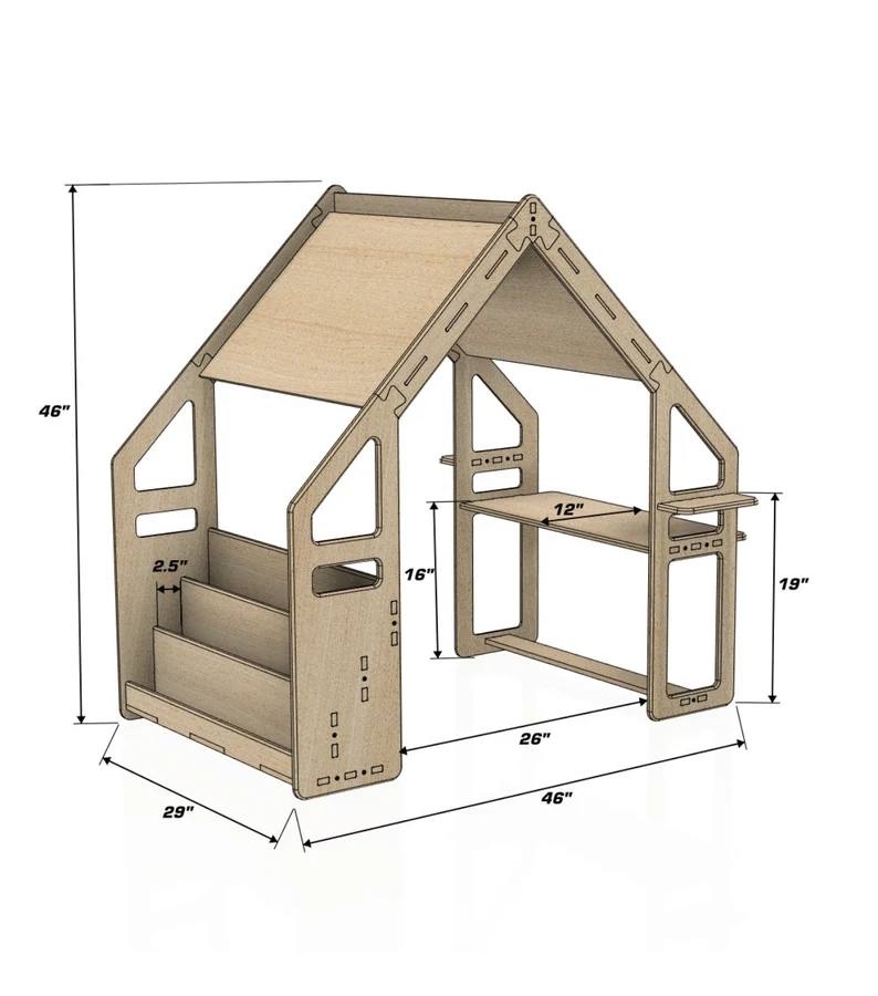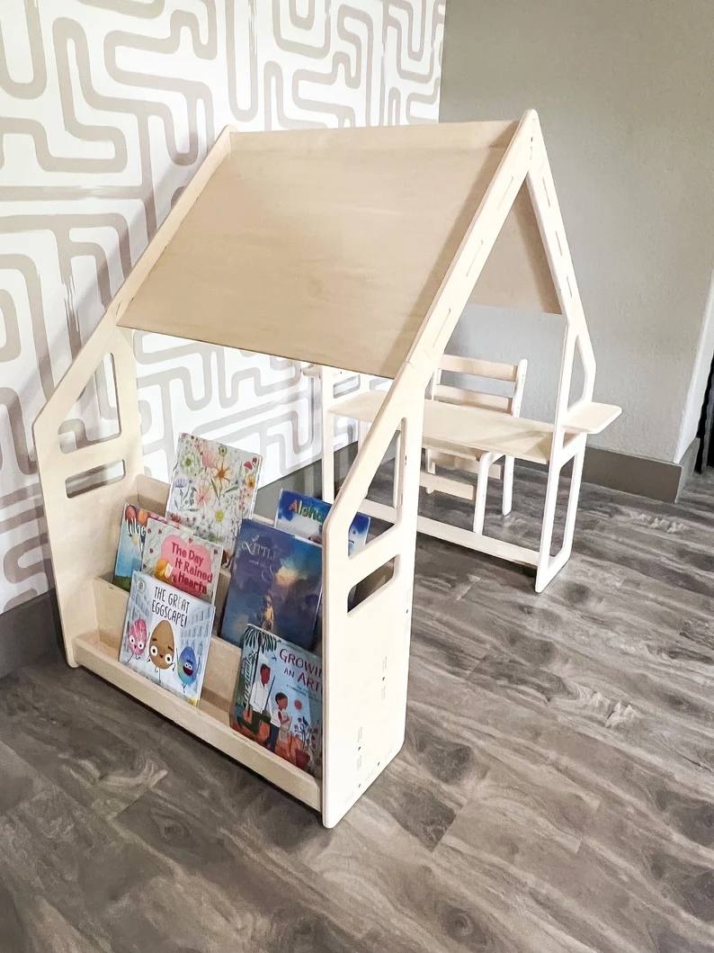 کتابخانه و میز مطالعه چوبی کودک مدل خانه ای | سبک مونتهسوری و طراحی فانتزی